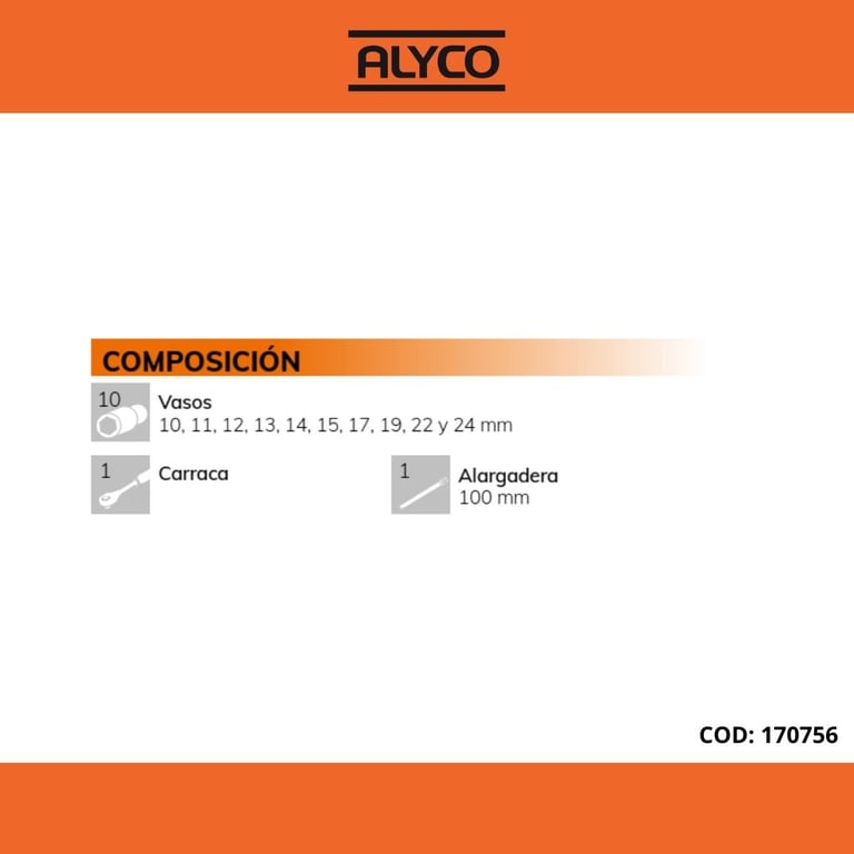 -Composicion: 10 vasos (10, 11, 12, 13, 14, 15, 17, 19, 22 y 24 mm.) / 1 carraca con inversor y expulsor de vasos de 72 dientes / 1 alargadera de 100 mm.