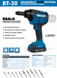 La remachadora Bralo BT-20 es una herramienta profesional para colocar la más amplia variedad de remaches. Combina la portabilidad con las más altas
