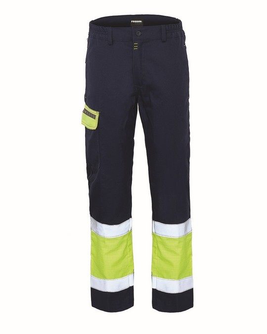 Pantalón de trabajo con elástico en los lados y cierre de solapa con cremallera de plástico y botón tradicional.
